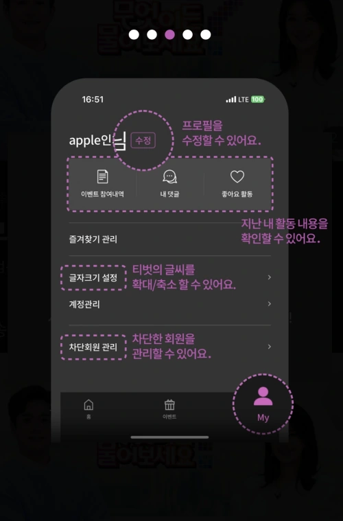 티벗 앱 My 메뉴에서는 프로필을 수정할 수 있고 지난 내 활동을 확인할 수 있습니다.