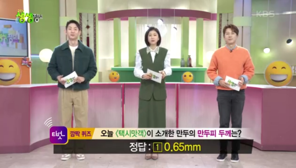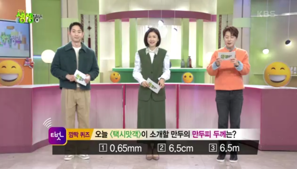 생생정보 방송을 시청하다 보면 아래처럼 문제의 정답 힌트를 바로 확인하실 수 있습니다. 처음에 나오는 생생정보 퀴즈 문제를 계속 생각하고 있다가 정답 힌트가 나오면 티벗 앱을 켜고 정답을 선택하시면 됩니다.