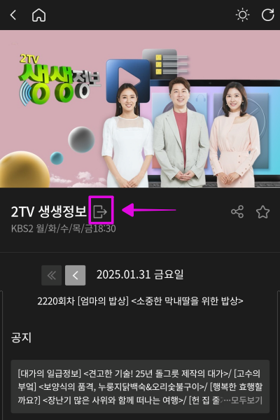 생생정보 이름 옆의 오른쪽 별을 누르면 즐겨찾기에 등록되어서 티벗 앱을 실행하고 바로 생생정보에 들어갈 수 있습니다.