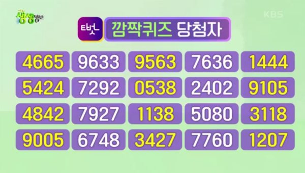 생생 정보 깜짝 퀴즈 정답 발표를 하고 바로 티벗 생생정보 퀴즈 당첨자의 전화번호 뒷자리도 발표됩니다. 처음에는 당첨자가 많지 않았지만 이제는 20명이 되면서 점점 늘고 있습니다.