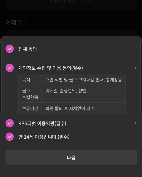 생생정보티벗 앱에서 사용할 닉네임과 출생연도, 이메일, 성별, 휴대폰 번호 등을 입력합니다.