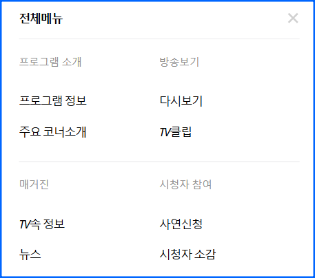 | 방송보기 | 최신 방송 미리보기, 다시보기, 코너별 클립 제공 | 놓친 방송은 다시보기로, 관심 코너만 선택해서 시청 가능 |