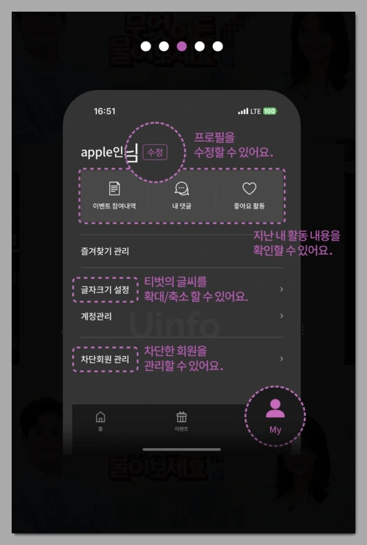 • 티벗 앱 My 메뉴에서는 프로필을 수정할 수 있고 지난 내 활동을 확인할 수 있습니다.