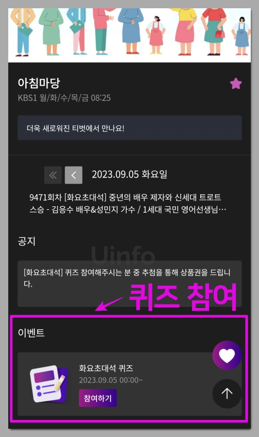 아침마당 퀴즈가 진행 중이면 이벤트 부분에 퀴즈 [참여하기]라고 나옵니다.